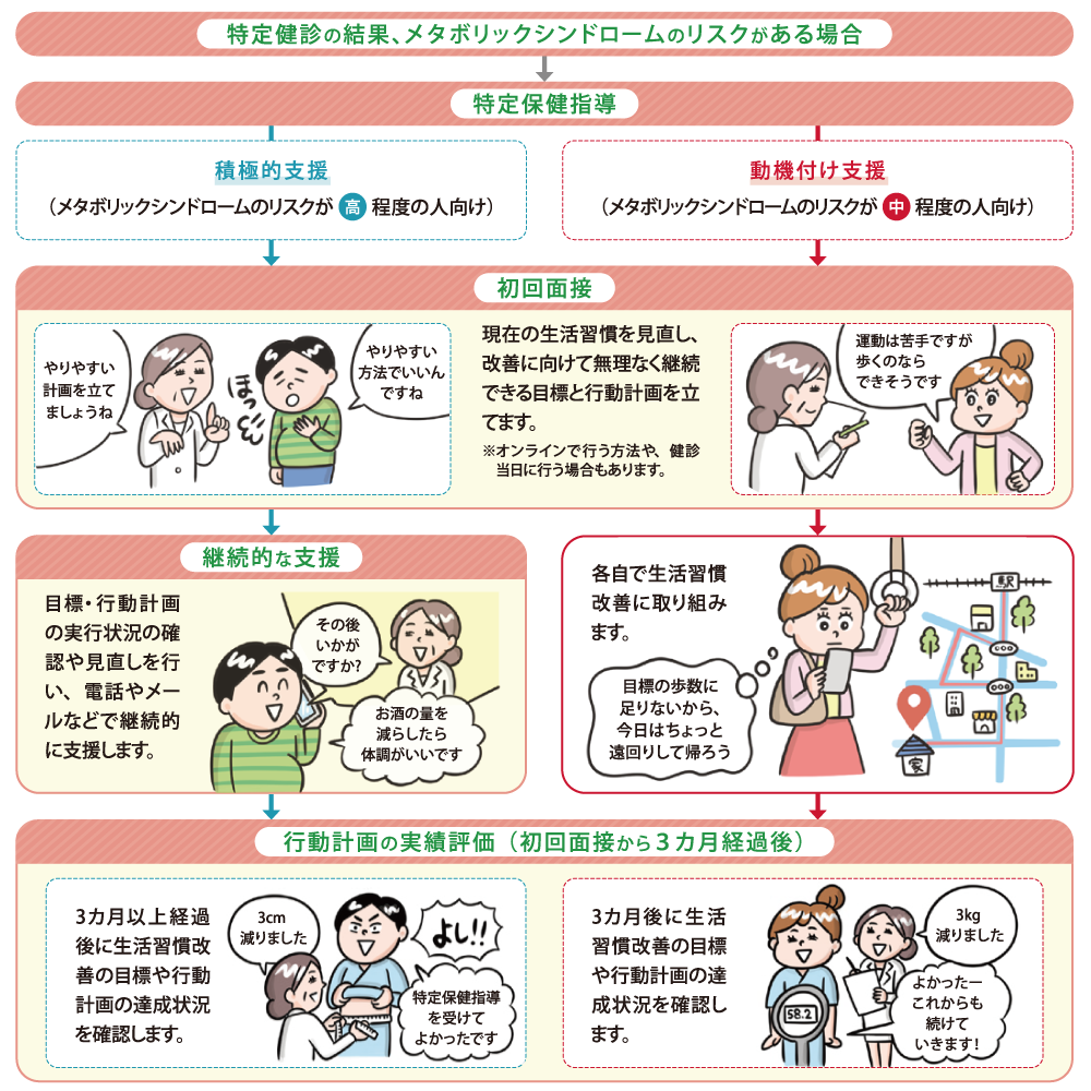 特定保健指導とは、特定健診の結果に基づき、主にメタボリックシンドロームの予防や解消を目的に、