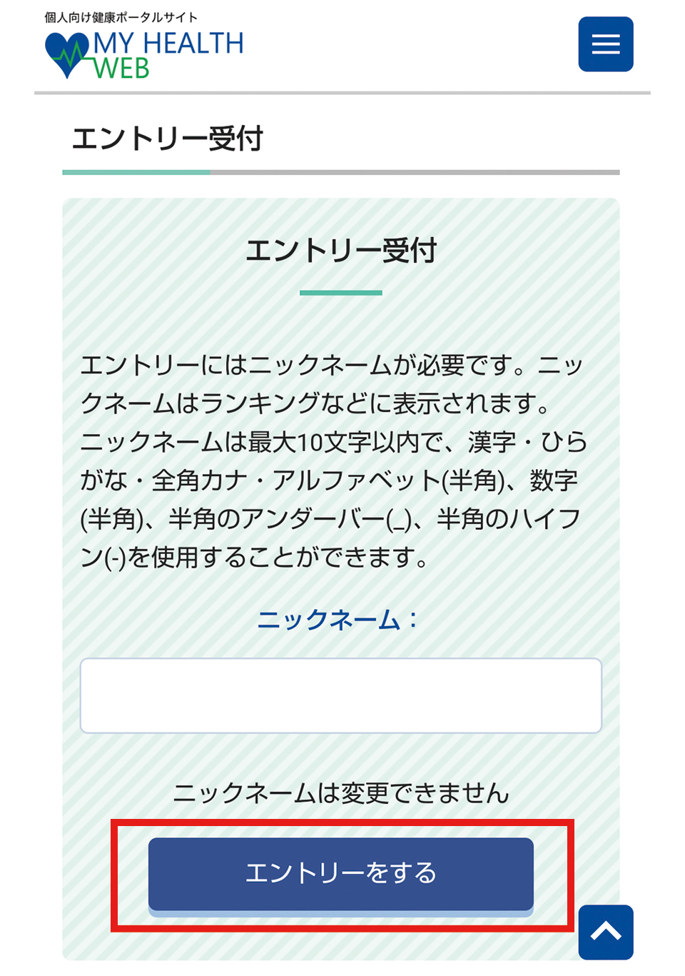 - エントリーページでは「ニックネーム」を入力し、「エントリーをする」を選択します。