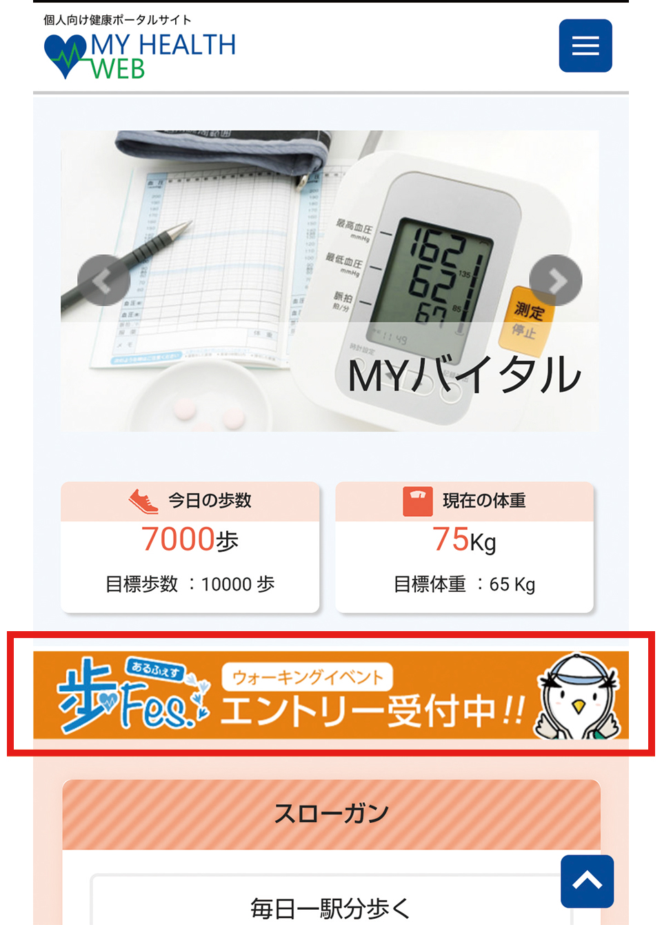 - マイヘルスウェブにログイン後、TOPページ内の「歩Fes.エントリー受付中」のバナーを選択し、エントリーページに進みます。