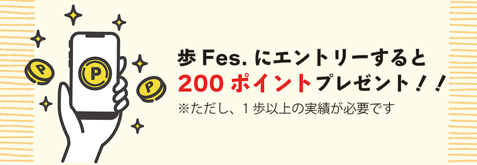 【個人戦】- ・エントリーで200ポイント進呈(ただし、1歩以上の実績ありの方)。