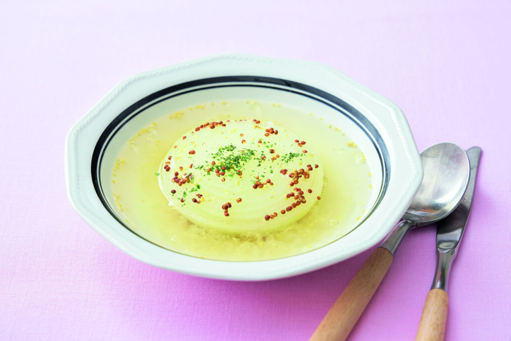●玉ねぎ1個は約76kcal と低カロリー食材。しかも玉ねぎを半分に切っただけなので、大ぶりで食べ応え抜群。切り方の工夫次第で満足感が高まります。また、ナイフ、フォークで切りながら食べるので、早食い防止にもおすすめ! 食べるスープとして楽しめます。