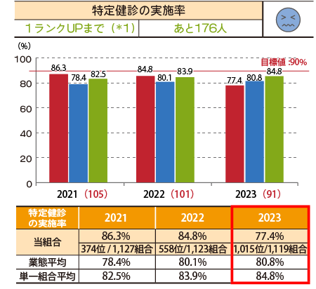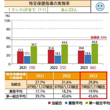 保険者と事業主とのコミュニケーションツールである2024年度版のスコアリングレポートが届きました。内容は、2023年度の特定健診、特定保健指導の実績になっています。昨年は663位、今回は824位とランクダウンしました。私たちが、取り組むべきポイントは、家族の健診受診率と特定保健指導の利用率の向上です。