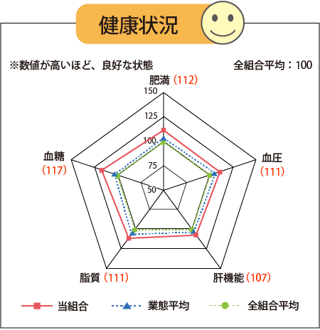 健康状況の経年変化 2021 2022 2023 肥満 当組合 113 111 112 業態平均 104 104 104 血圧 当組合 118 108 111 業態平均 106 106 106 肝機能 当組合 111 107 107 業態平均 103 103 103 脂質 当組合 120 114 111 業態平均 106 106 106 血糖 当組合 112 110 117 業態平均 103 103 103 -