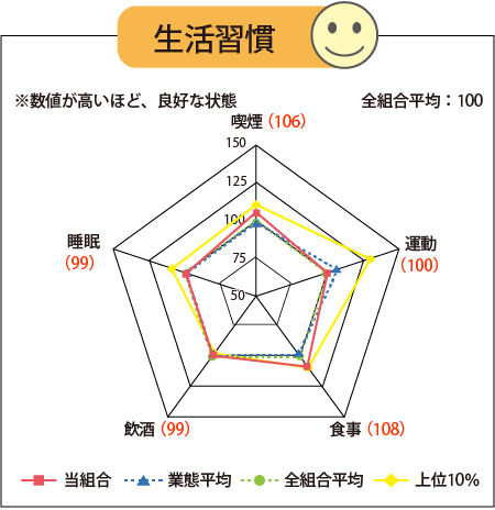 生活習慣の経年変化 2021 2022 2023 喫煙 当組合 105 106 106 業態平均 99 99 99 上位10% 113 113 111 運動 当組合 104 102 100 業態平均 107 107 107 上位10% 134 129 130 食事 当組合 108 108 108 業態平均 99 98 98 上位10% 109 109 109 飲酒 当組合 100 99 99 業態平均 99 99 99 上位10% 99 97 97 睡眠 当組合 103 103 99 業態平均 100 99 99 上位10% 115 114 109