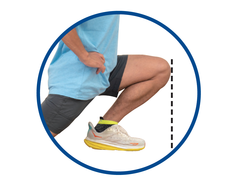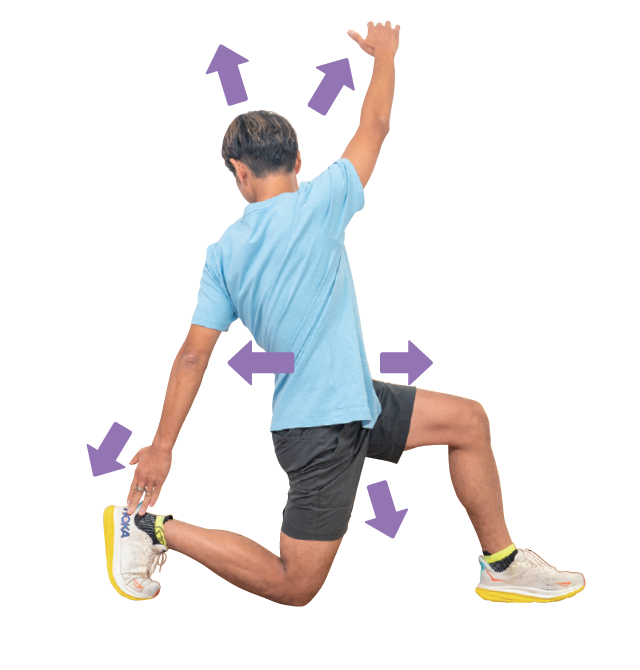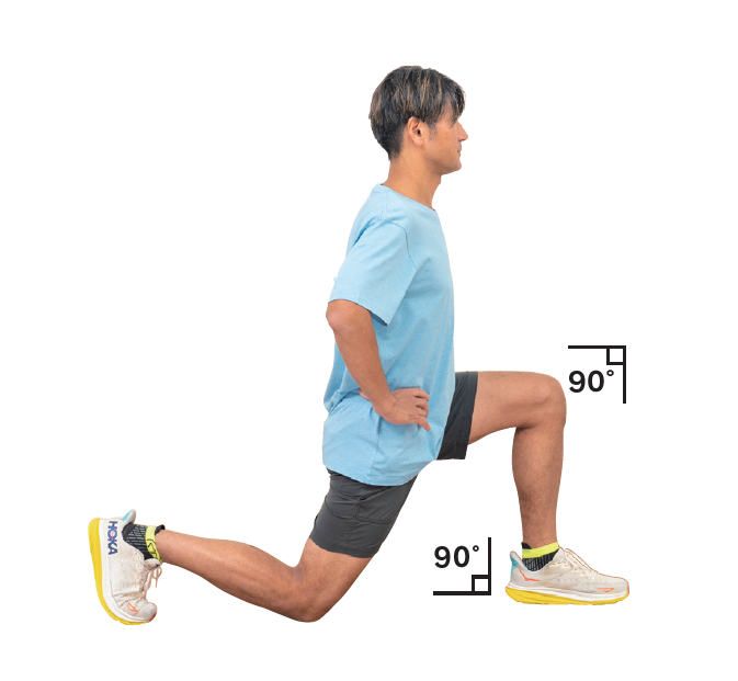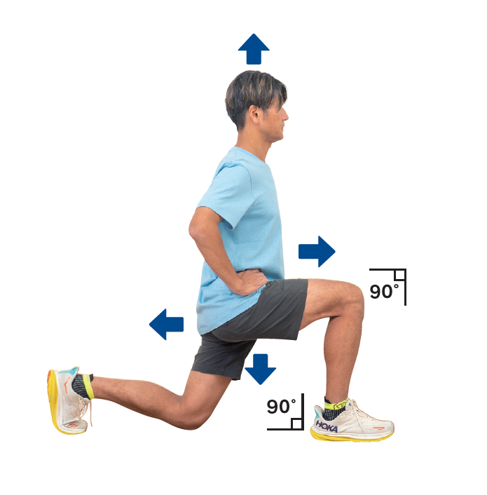 右足を後ろに大きくステップバックし、左足首、膝が90 °になり右膝が床につくまで沈み込む。