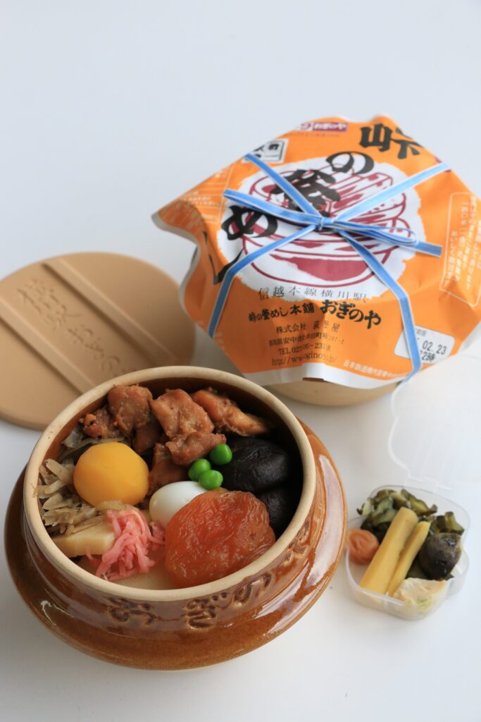 荻野屋の峠の釜めしは昭和33年に信越本線横川駅で発売が開始された人気の駅弁。保温性を考慮して陶器の器が使われている。