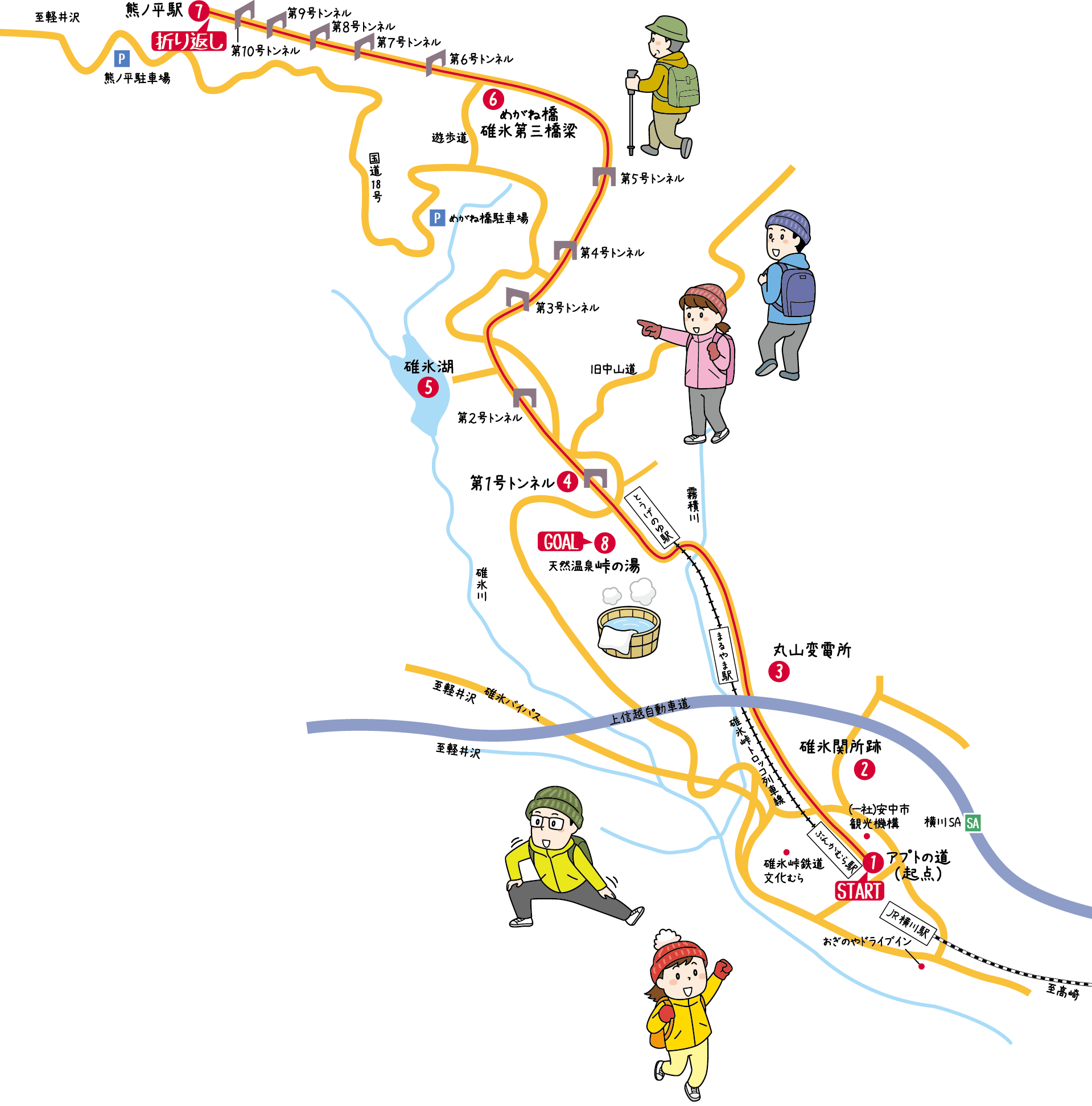 アプトの道に戻りしばらく行くと丸山変電所がある。レンガ造りの建物で、蓄電池室と機械室の2棟が並んでいる。丸山変電所を過ぎてしばらく歩き、左折して線路をくぐると峠の湯。レストランがあり食事もできる。さらに進むと第1号トンネルに入る。中は照明があり安全に歩ける。第2号トンネルを抜けると、碓氷湖が左手に見えてくる。湖畔に下りて美しい湖面を見ながら休憩するのもよい。第3号、第4号トンネルを過ぎ、第5号トンネルを抜けるとめがね橋に出る。200万個以上のレンガを使用した大きな橋で、下をのぞくと足がすくむ。遊歩道の階段で国道18号に下りると、下から橋を仰ぎ見ることができる。